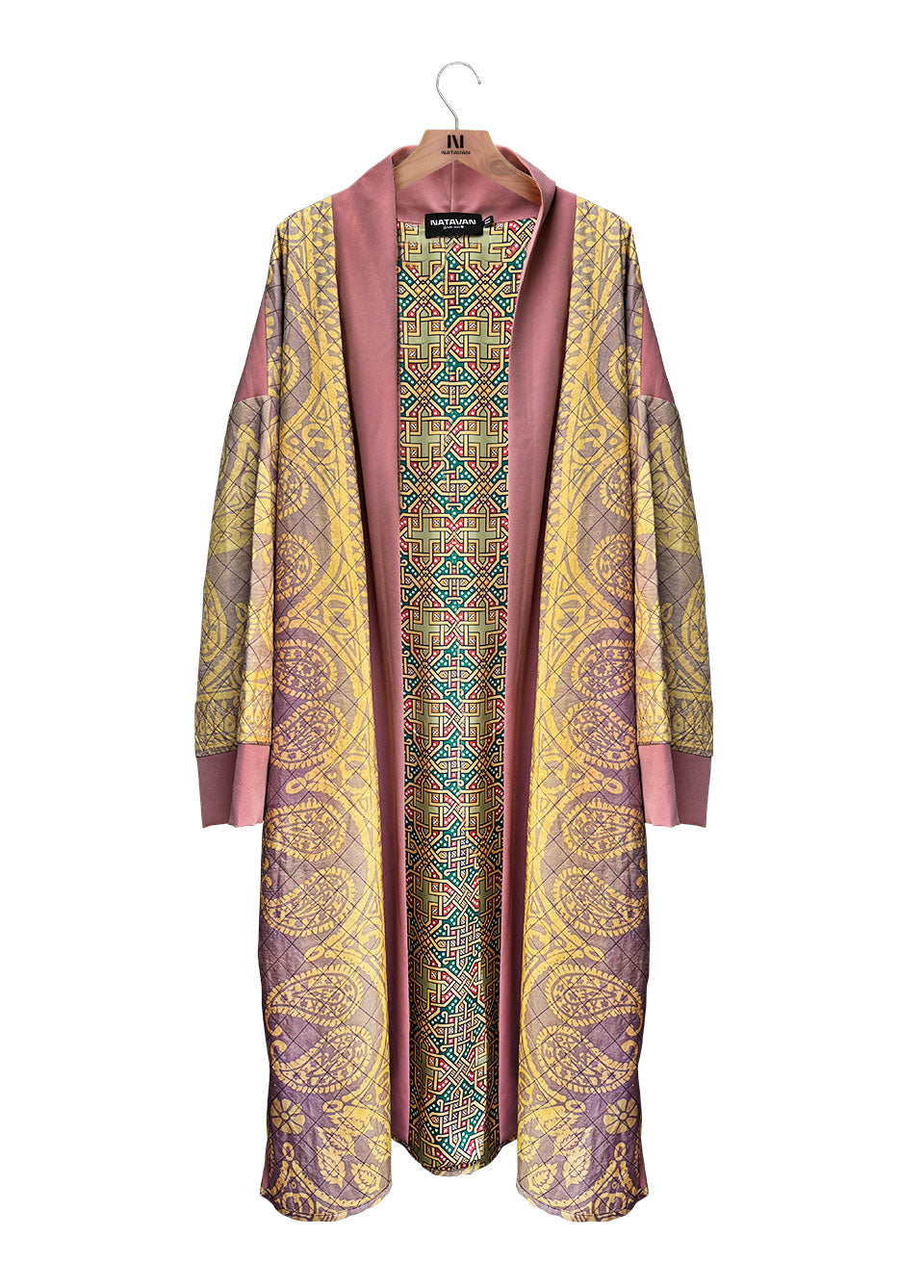NATAVAN signature TIKIS kaftans are made of sheer silk and adorned with authentic Azerbaijani prints. The details, along with the lapels and the inner lining, are of a contrasting colour. This particular model features a beautiful combination of lilac, cream and dusty rose pink.